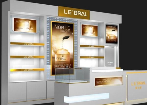 在化妝品展示柜設計中還有一種比較高檔的也是用的比較多的就是超薄燈箱了,這樣燈箱厚度非常的薄,一般在2公分厚度左右,而且更換畫面,移動位置等等都非常的方便,特別是水晶超薄燈箱,不但有這些好處之外,最主要的是非常的美觀,和展示柜搭配起來也相當?shù)娘@檔次。唯一不足的就是,這樣的燈箱價格比較高,一般預算比較好的品牌公司會選擇這樣的燈箱。