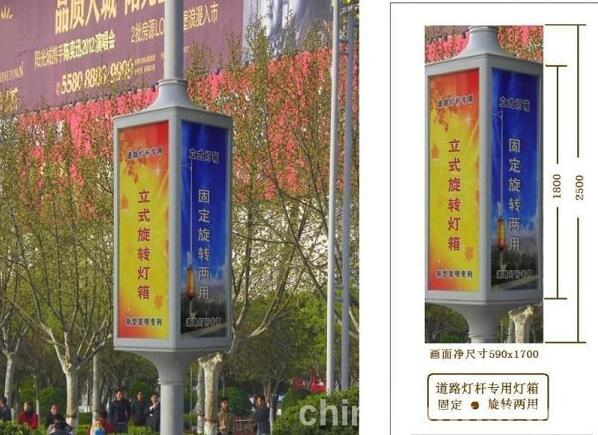 旋轉(zhuǎn)燈箱外形線條流暢,造型高檔美觀,旋轉(zhuǎn)速度均勻,動(dòng)感強(qiáng)烈,其動(dòng)態(tài)的自動(dòng)旋轉(zhuǎn)效果,提高了廣告的視覺(jué)沖擊力,加強(qiáng)了廣告的層次感。